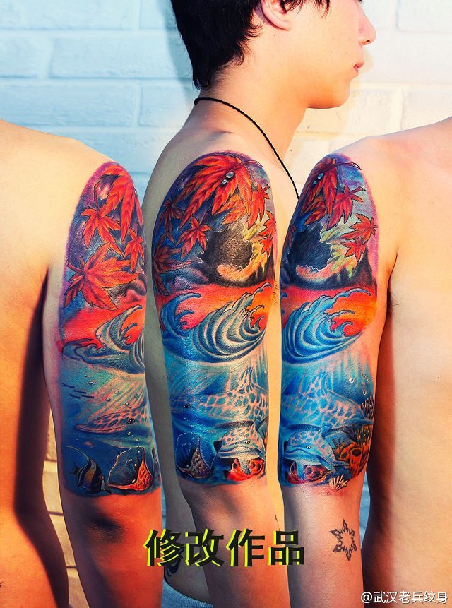 武汉最好纹身店打造的大臂修改--海洋世界纹身作品
