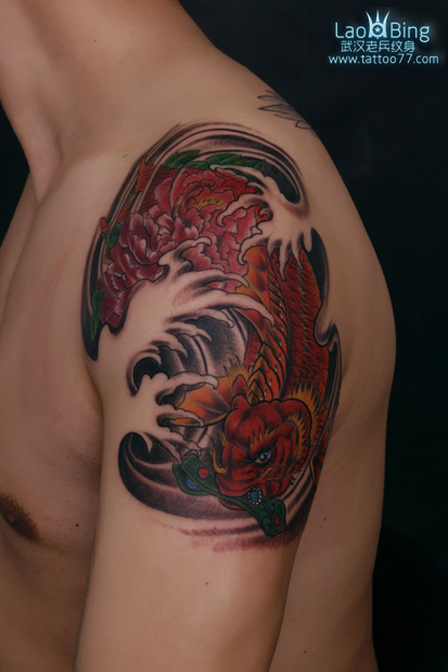 武汉纹身店:大臂招财鲤鱼纹身图案作品