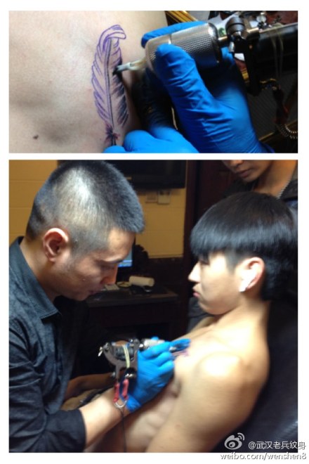 武汉中央荣御老兵纹身店兵哥在给吴家山的客人做羽毛字母纹身