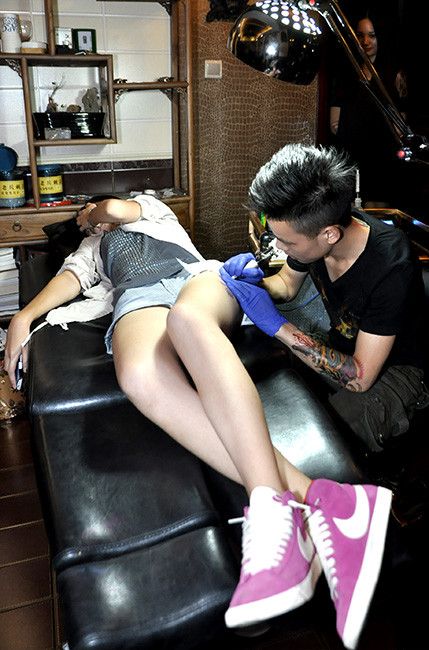 疯子在美腿上做纹身哦