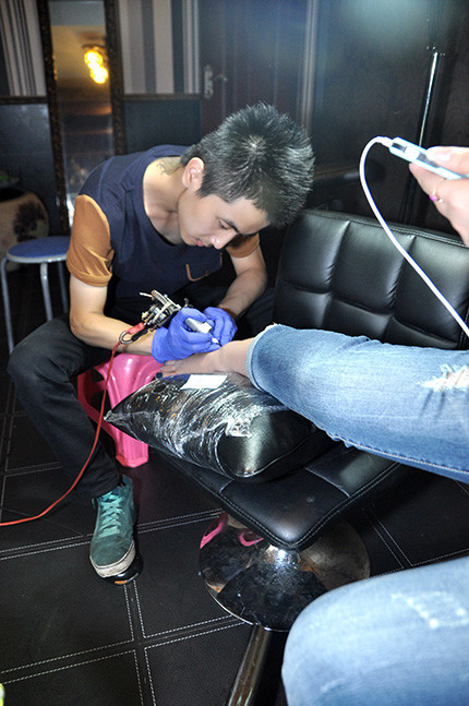 武汉纹身师喻迪给美女打造脚踝图腾纹身