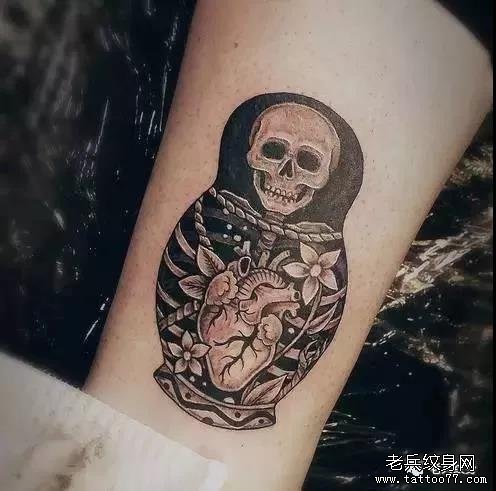 组合了俄罗斯套娃,心脏,骷髅头骨的独特纹身
