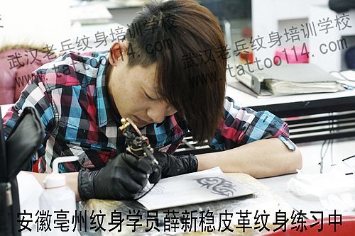 武汉最好的纹身学校:安徽纹身学员薛新稳皮革纹身练习中
