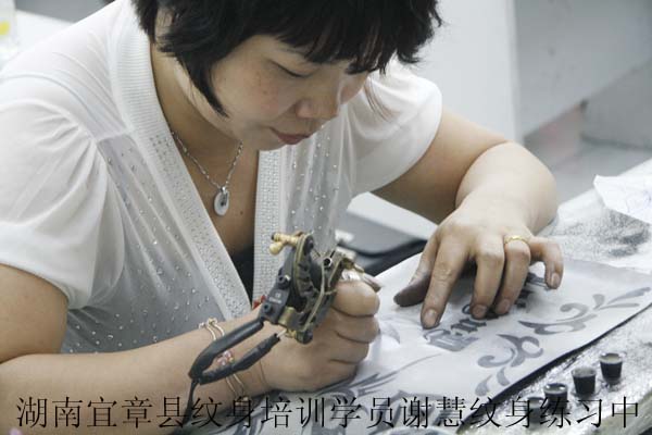 湖南宜章县纹身培训学员谢慧纹身练习中