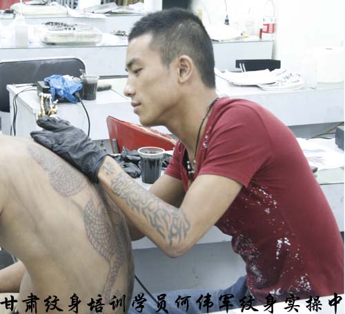 甘肃专业文身培训学员何伟军满背纹身图案实操中