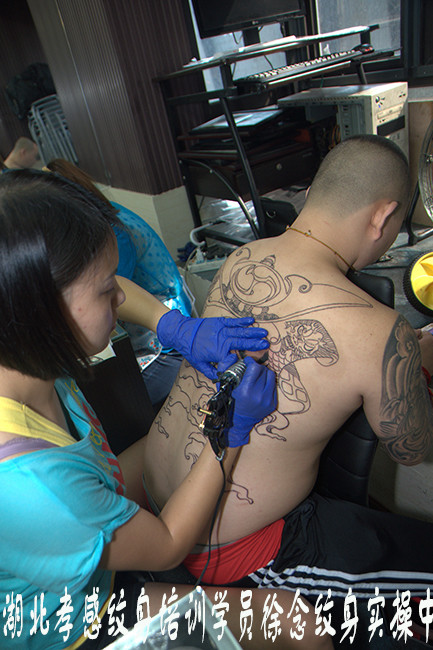 武汉纹身培训网:监利纹身学员江舟峰满背纹身实操中