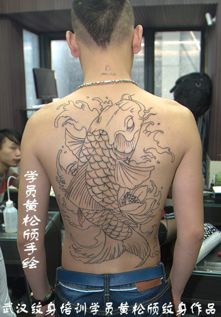 满背鲤鱼线条纹身作品由武汉纹身学员黄松颀制作