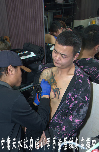 武汉正规纹身学校纹身学员董星披肩龙纹身图案实操中