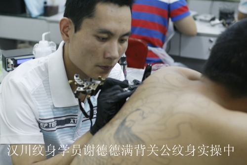 纹身学校:汉川纹身学员谢德德满背纹身图案实操中