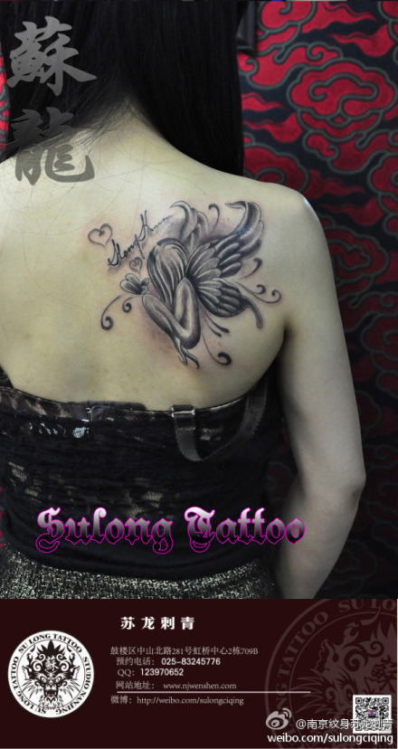 女生肩背流行好看的小天使纹身图案