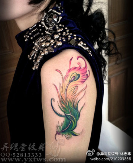女人手臂漂亮好看的彩色羽毛纹身图案