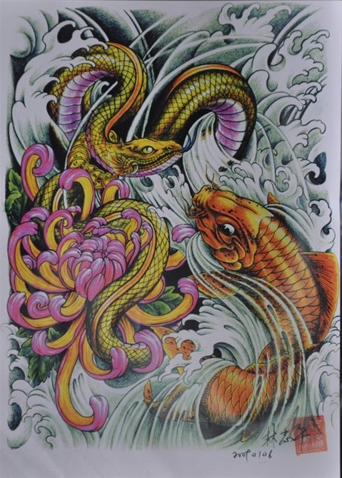 蛇鲤鱼菊花纹身手稿图由武汉纹身网提供