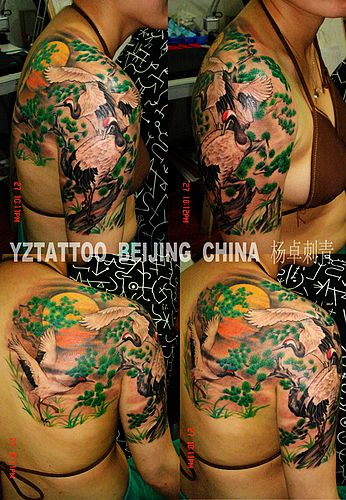 武汉专业老兵文身店:半胛仙鹤梅花纹身图案图片
