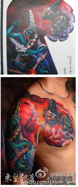 一款超酷经典的彩色半胛黑白无常纹身图案