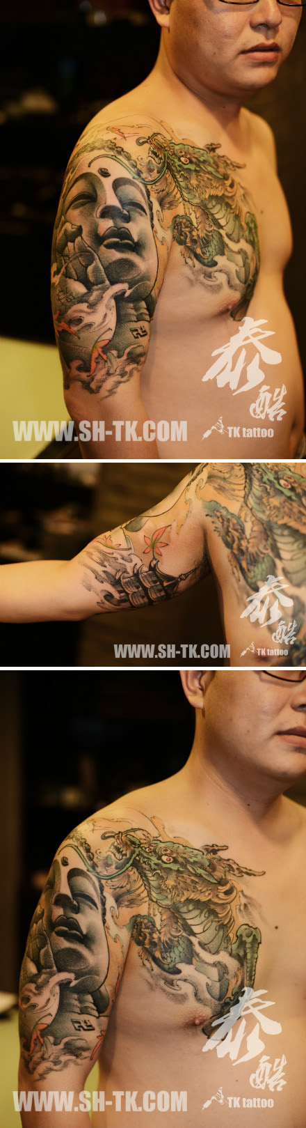潮流时尚的一款半胛佛头麒麟纹身图案