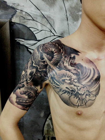 男生喜欢的很帅经典的一款黑灰半胛龙纹身图案