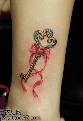 腿部彩色钥匙蝴蝶结纹身图案