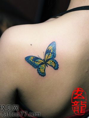美女肩部漂亮的彩色蝴蝶纹身图案