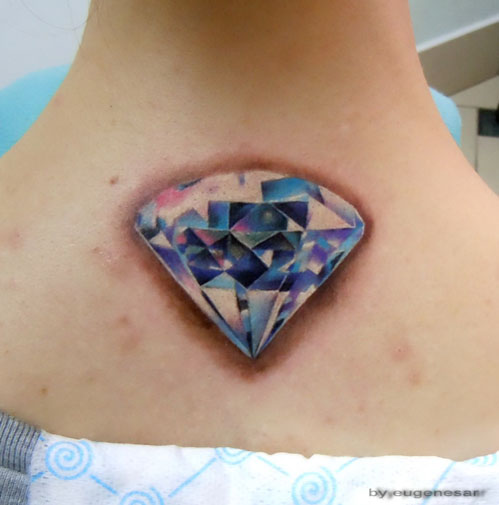 女生颈部超炫的彩色钻石纹身图案