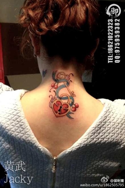 女生颈部时尚精美的爱心锁与钥匙纹身图案