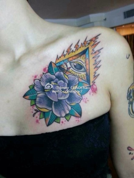 女生胸前漂亮的玫瑰花上帝之眼纹身图案