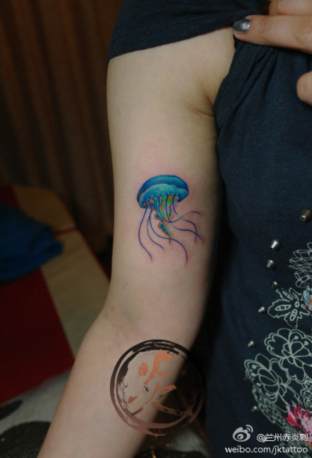 手臂漂亮精美的彩色水母纹身图案