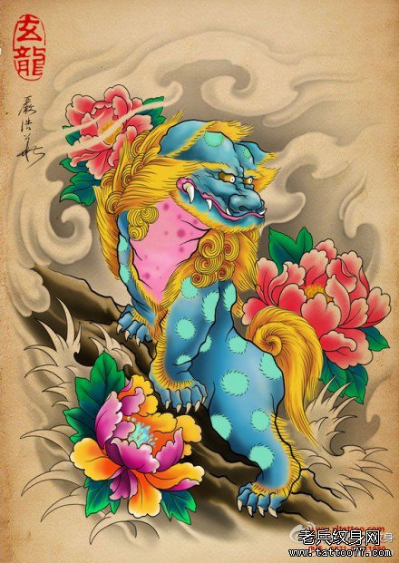 一款漂亮超酷的彩色唐狮子纹身图案