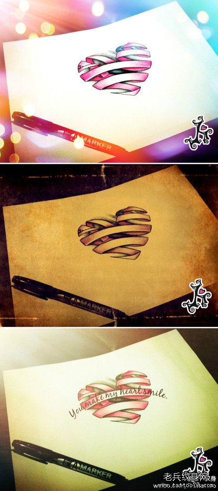 一款潮流时尚的爱心飘带纹身图案