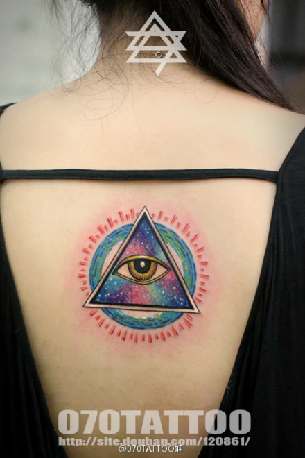 美女后背漂亮精美的彩色星空全视之眼纹身图案