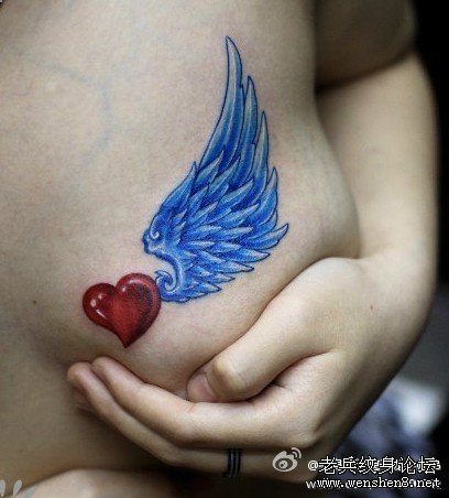 胸部彩色爱心翅膀纹身图案大全