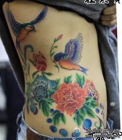 腰部彩色喜鹊牡丹纹身图案纹身图片