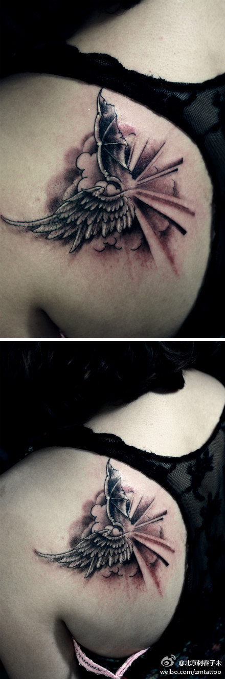 女生肩背小巧的一半天使一半恶魔翅膀纹身图案