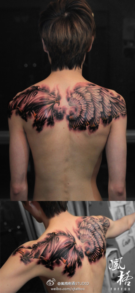 男生后背半背一半天使一半恶魔翅膀纹身图案