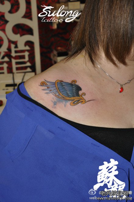 女生肩膀处潮流小巧的彩色翅膀纹身图案