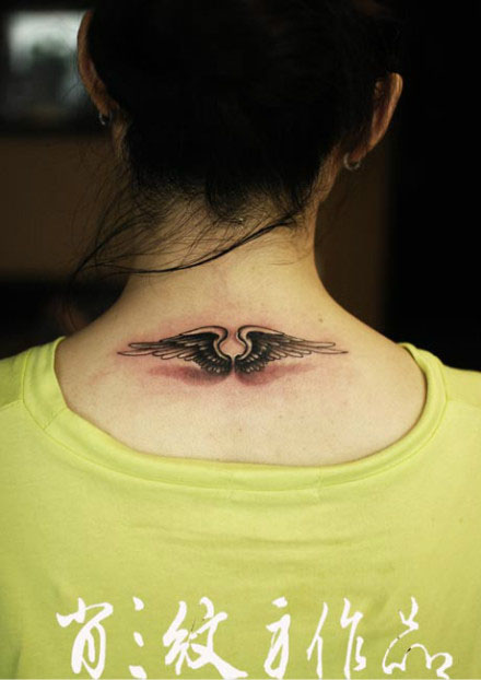 女生后脖子经典小巧的黑灰翅膀纹身图案