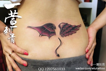 女生腰部经典的恶魔与天使翅膀纹身图案
