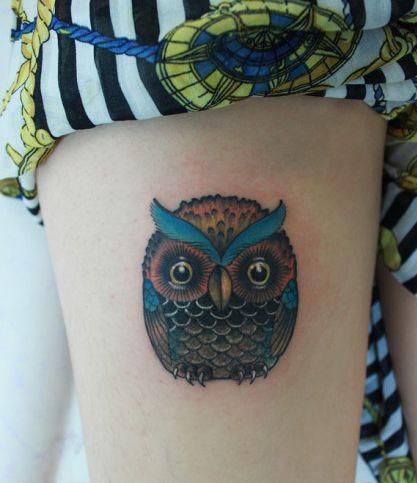 女孩子腿部时尚流行的猫头鹰纹身图案