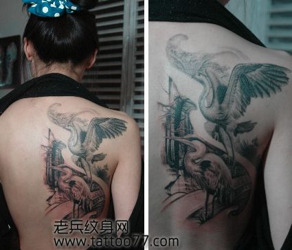 美女背部精美的白鹤仙鹤纹身图案