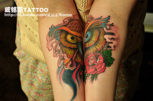女生手臂时尚经典的new school猫头鹰纹身图案