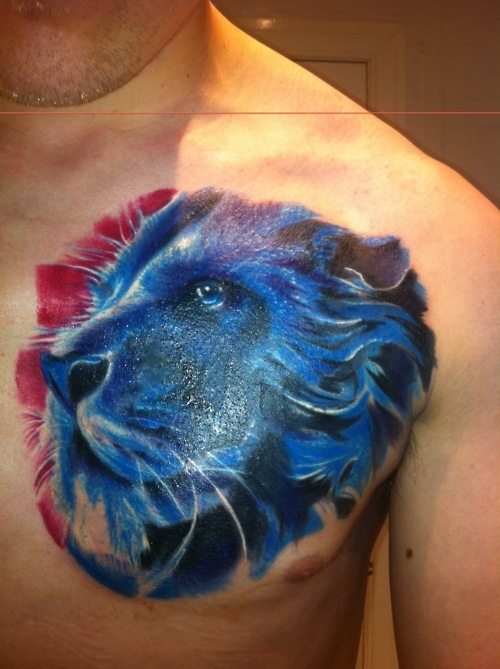 男人胸前超酷的彩色狮头纹身图案
