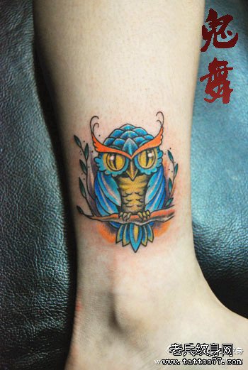 腿部一款小巧潮流的彩色猫头鹰纹身图案