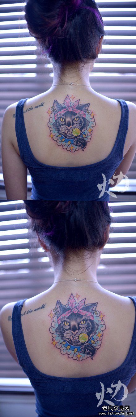 美女后背吃棒棒糖的猫咪纹身图案