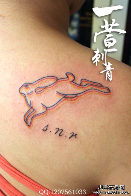 女生后肩背潮流时尚的幻影兔子纹身图案