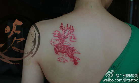 女生后肩背经典时尚的图腾梅花鹿纹身图案
