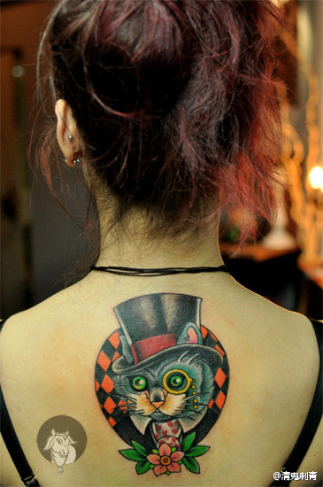 女生后背潮流时尚的猫咪先生纹身图案