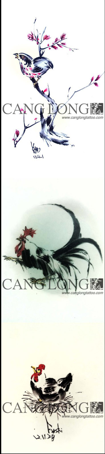 一组水墨风格的小鸟公鸡母鸡纹身手稿