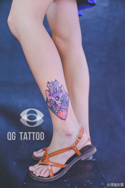 女生腿部时尚潮流的猫咪与钻石纹身图案