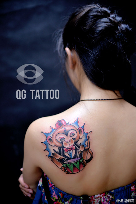 女生肩背潮流时尚的敲鼓的猴子纹身图案
