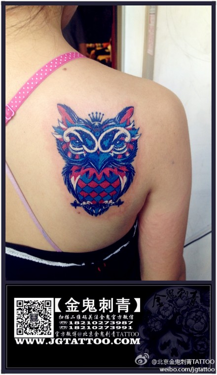 女生肩背潮经典的图腾猫头鹰纹身图案