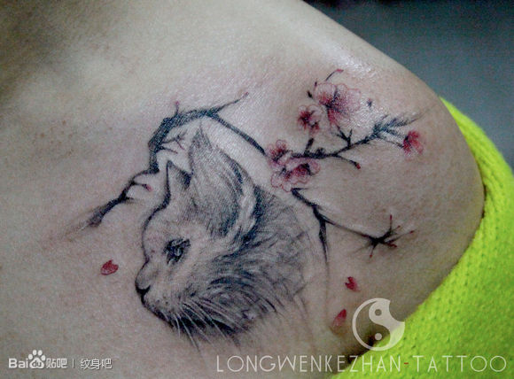 女生肩膀处可爱的猫咪与梅花纹身图案